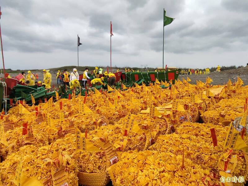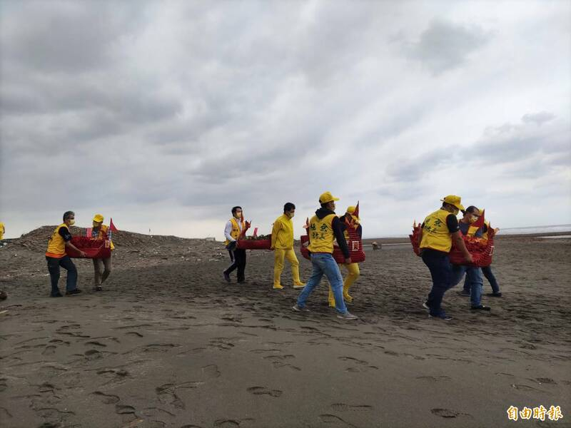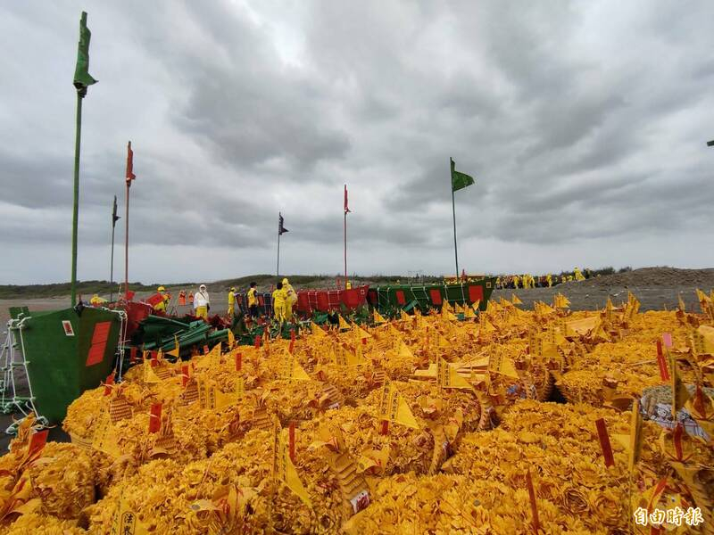 志工將紙法船一艘艘搬運至海灘,進行化法船儀式。(記者鄭淑婷攝)