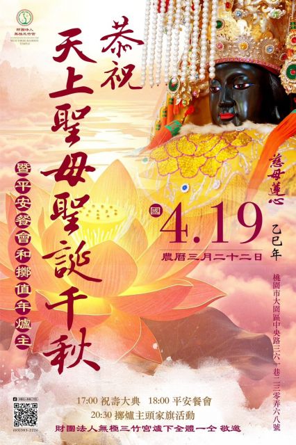 感念天上聖母三媽祖慈悲守護與庇佑,無極三竹宮宮下信眾謹訂於4月19日(農曆三月廿二日)隆重舉辦「天上聖母祝壽慶典」,誠摯邀請各界諸位善信回宮共襄盛舉。 . 當日除了莊嚴隆重的祝壽儀式,更精心安排豐富精彩的活動,現場並備有平安餐宴,誠摯邀請各位一同享用美味佳餚,感受神恩庇佑,促進情感交流,共享溫馨時光。 . 餐宴結束後,更有本宮特別舉