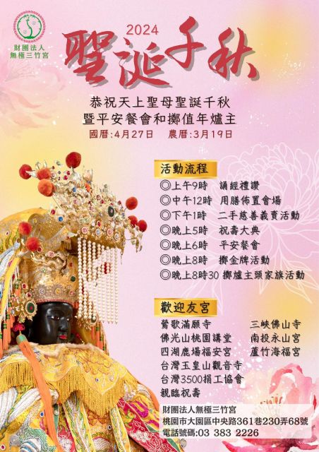 kubet ไทยคาสิโนออนไลน์ 各位信眾大家好 . 三竹宮宮下信眾感念崇敬三媽祖的守護和庇佑,將於4月27日舉辦天上聖母祝壽慶典活動。祝壽慶典除了莊嚴神聖祝壽儀式,還有許多精彩的活動,敬邀請各位諸善信回宮一同歡慶。 . 當日將有二手物品義賣活動,募集善款支持本宮公益事業。參與義賣的人們不僅能購買到物美價廉的物品,還能為公益事業獻出一份心力。慶典的晚宴上,備有平