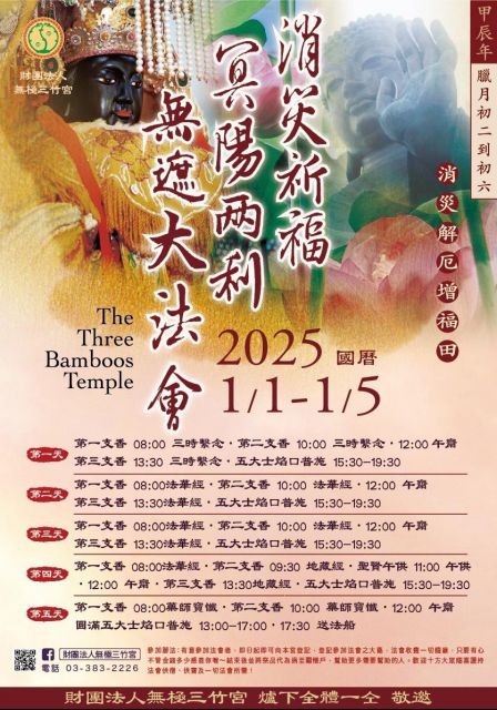 菩提一善念 世代積福德 慈悲心中燃 同行菩薩道 財團法人「無極三竹宮 無遮大法會」 在每一位志工的努力下 一步一腳印 一點一滴的將法會所有細節 一一組合起來 只願無形眾生能在 這殊勝的機會與日子 早日