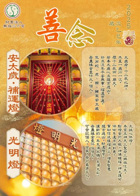 乙巳蛇年即將到來,一年即將過去 新的一年,期待各位都能有更美好的展望! 接下來的2025年,無極三竹宮預祝眾善信大德, 在未來的每一天,更加平安順心 期待我們一起將『善念』的種子種於心田, 為這個社會灌溉出更多的良善幼苗~ 點亮自己照亮他人~ 跟大家公