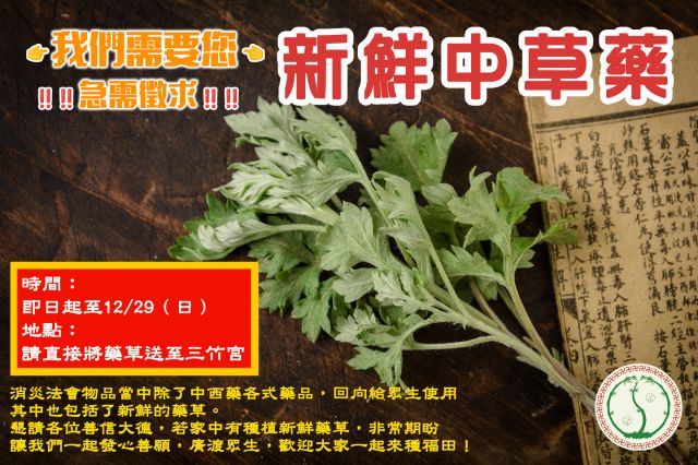 說明:法會的物品當中都有放置中藥西藥各式的藥品,回向給眾生使用,其中也包括了新鮮的藥草 徵求家中有種植藥草的善心大德!若您的家裡有種植新鮮的藥草,歡迎大家一起來種福田! . 時間:即日起至12/29(日) 地點:請直接將藥草送至三竹宮 . 慈悲心中燃。點滴善水聚 匯集汪洋海,普願渡蒼生 . ◎ 濟世日:每週日,隔周六、日下午一點開始登記。 ◎ 欲請示之善信請親臨本宮稟香報名。