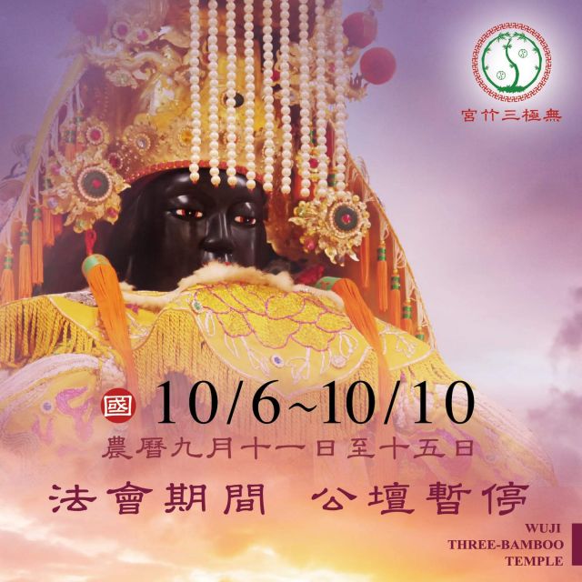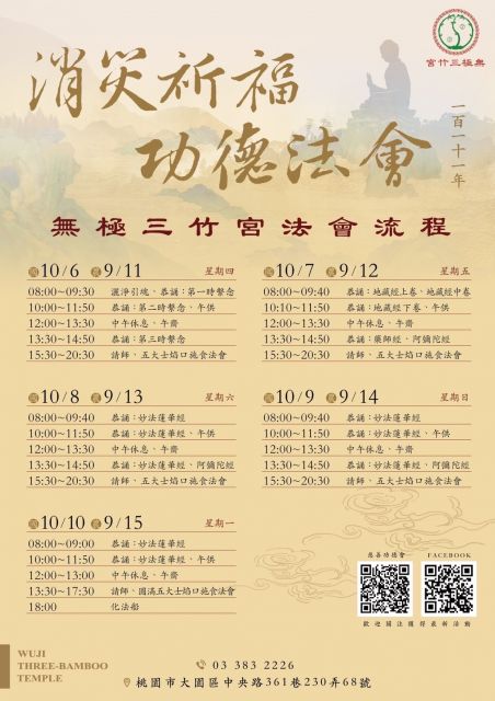 2022年無極三竹宮 消災祈福功德法會 起因全球疫情、天災、人禍不斷,造成無數的眾生不幸的往生, 經本宮 天上聖母 三媽祖 聖駕指示,為了普渡世間有情及無形眾生,將舉辦消災祈福功德法會,讓眾生得到佛菩薩護佑,消災解厄、離苦得樂,使冥陽兩利,培福添慧。 參加法會時,持恭敬心,悟佛陀心。深明其中的本懷與懺儀 【時間】 ◉ 國曆111年10月6~10日 ◉ 農曆壬寅