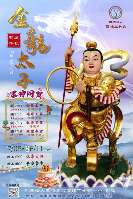 無極三竹宮於國曆7月5日在宮內盛大舉辦了年度的金龍太子聖誕平安餐會,信眾皆熱情回宮參與盛會,將宮廟內外點綴得熱鬧非凡,充滿隆重與溫馨。 當天上午,莊嚴肅穆的課誦經典科儀中,住持、董事及眾執事委員們帶領信眾們虔誠,一同為金龍太子獻上最誠摯的祝福。宮內響徹著梵音繚繞,香煙裊裊,營造出祥和寧靜的氛圍。信眾們依序上香祈福,祈求金龍太子庇佑闔家平安、事業順遂。